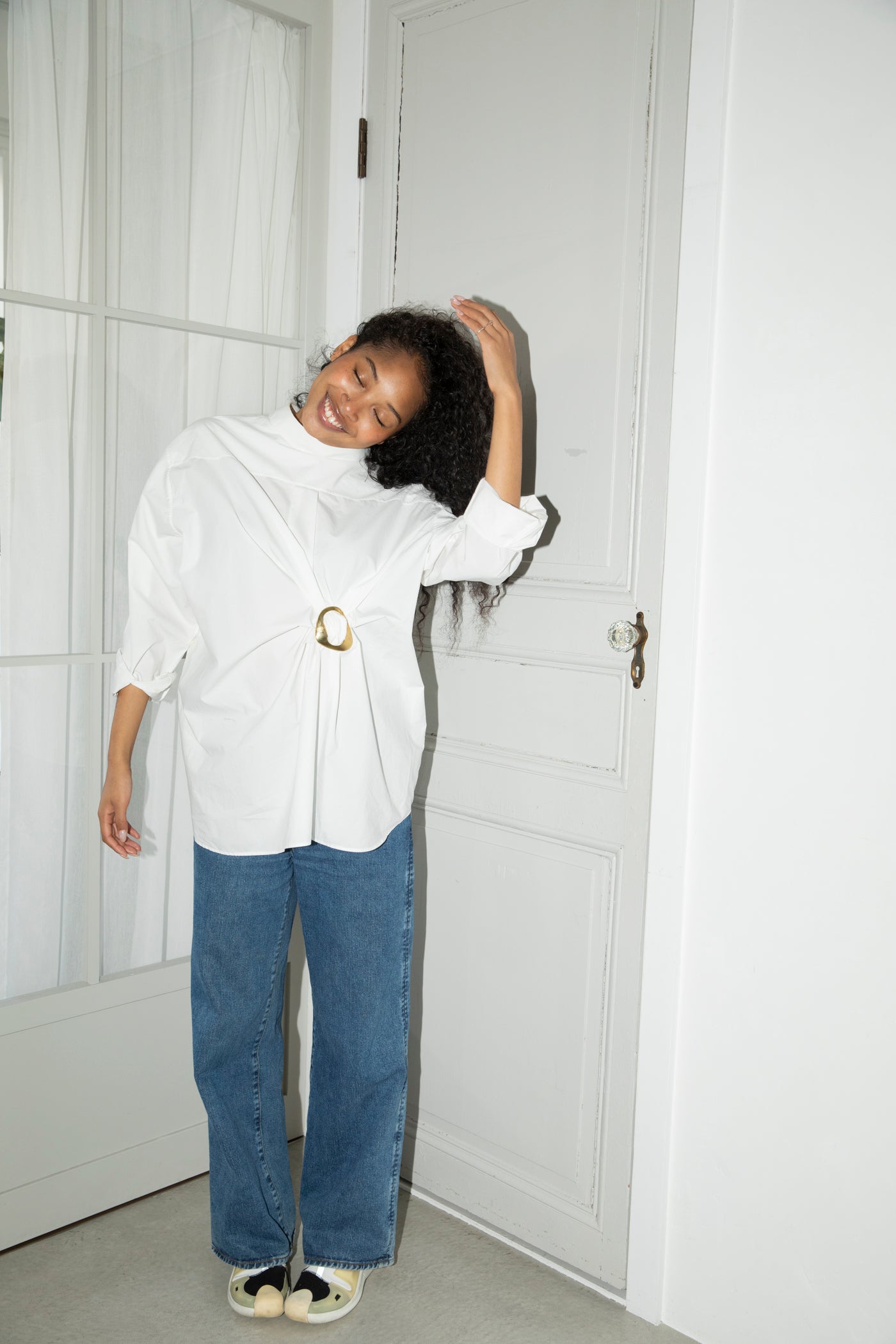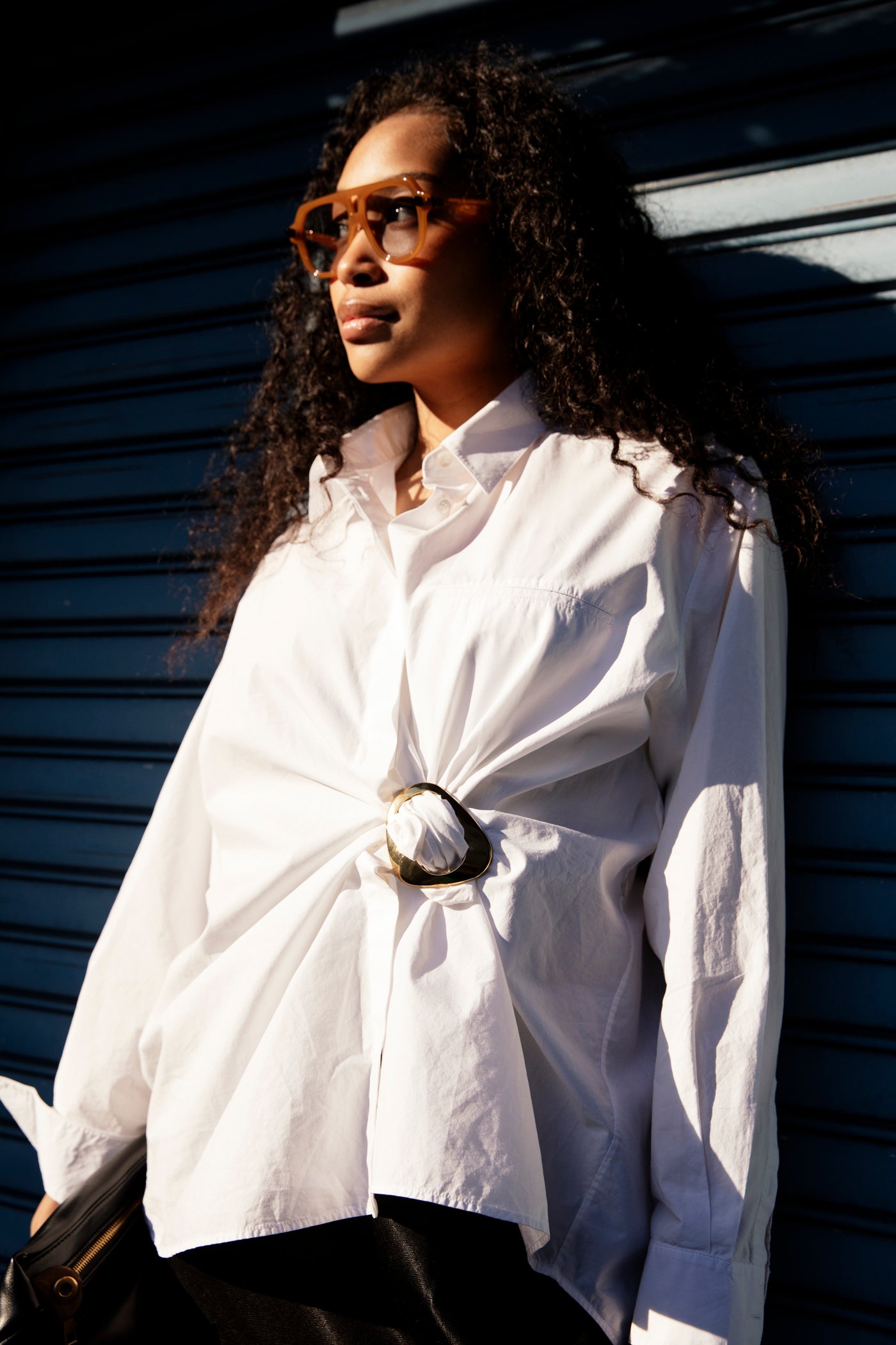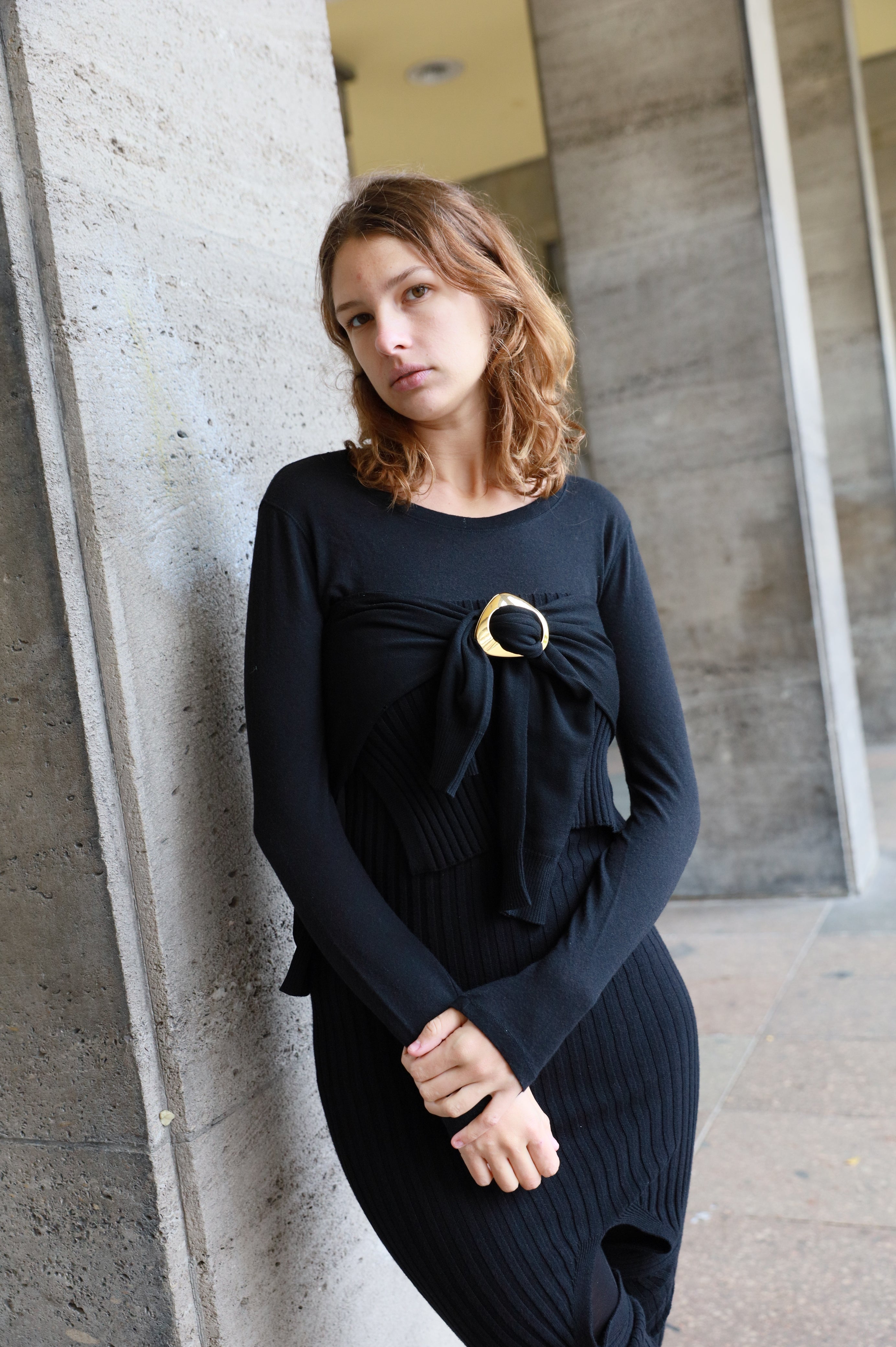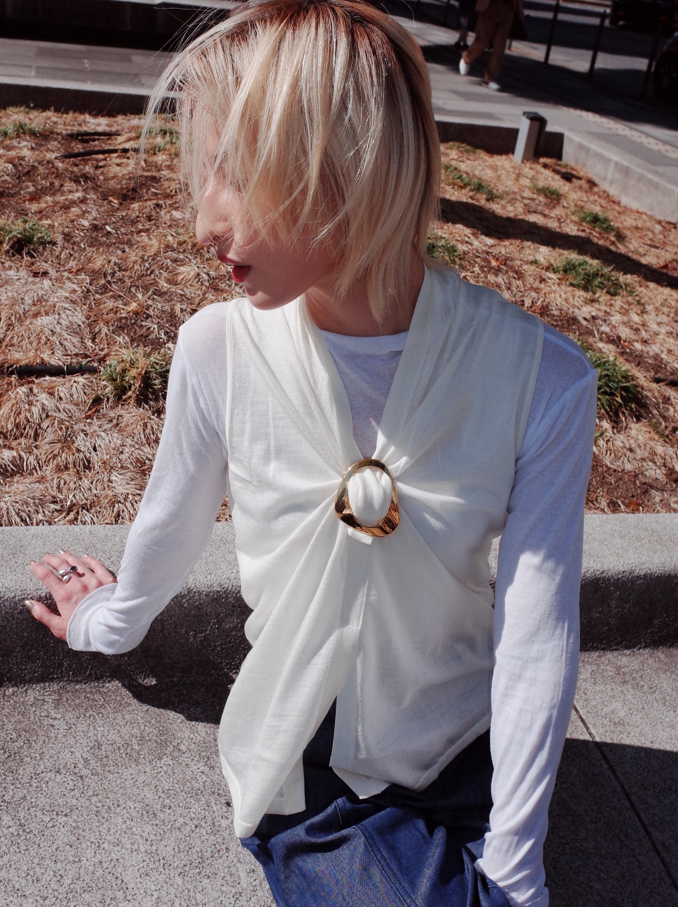 A two-piece accessory with strong, fitted magnets. Use it to loop fabric through the two holes to add textures, shorten your simple tees, bond fabrics together,or secure layered pieces in place. Lightweight and pleasing to hold.