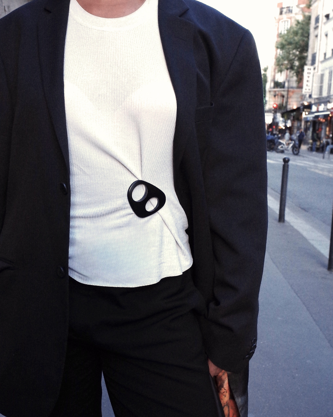 A two-piece accessory with strong, fitted magnets. Use it to loop fabric through the two holes to add textures, shorten your simple tees, bond fabrics together,or secure layered pieces in place. Lightweight and pleasing to hold.